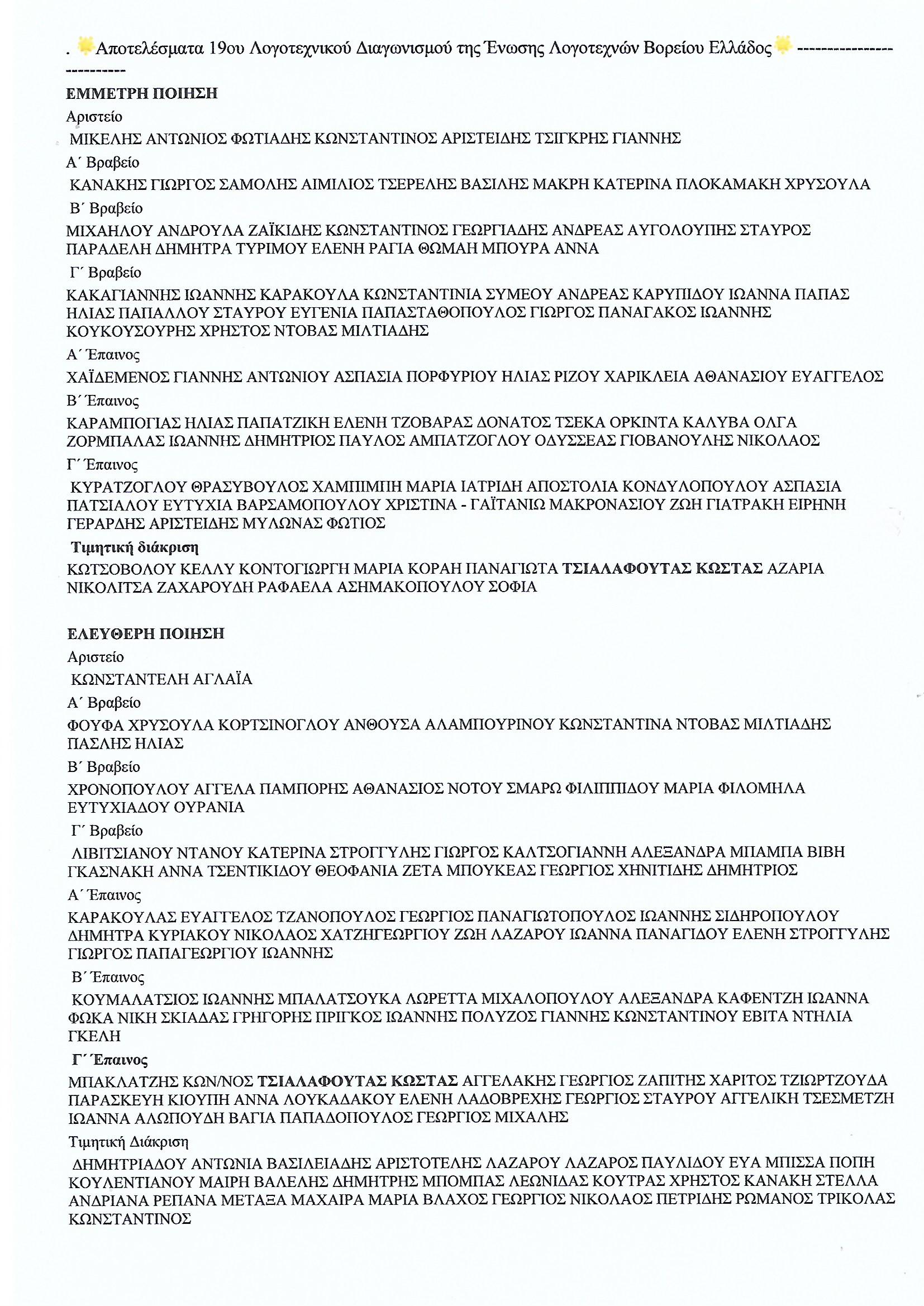 β) Τιμητική Διάκριση για το ποίημά του «Κοινωνίες άσηπτες», στην κατηγορία Έμμετρης Ποίησης.