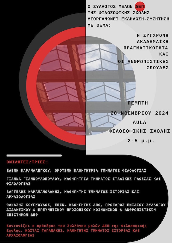 Εκδήλωση-συζήτηση με θέμα «Η σύγχρονη ακαδημαϊκή πραγματικότητα και οι ανθρωπιστικές σπουδές» διοργανώνει ο Σύλλογος μελών ΔΕΠ της Φιλοσοφικής Σχολής του ΕΚΠΑ την Πέμπτη 28 Νοεμβρίου από τις 14:00 έως τις 17:00 στην Aula της Φιλοσοφικής Σχολής.